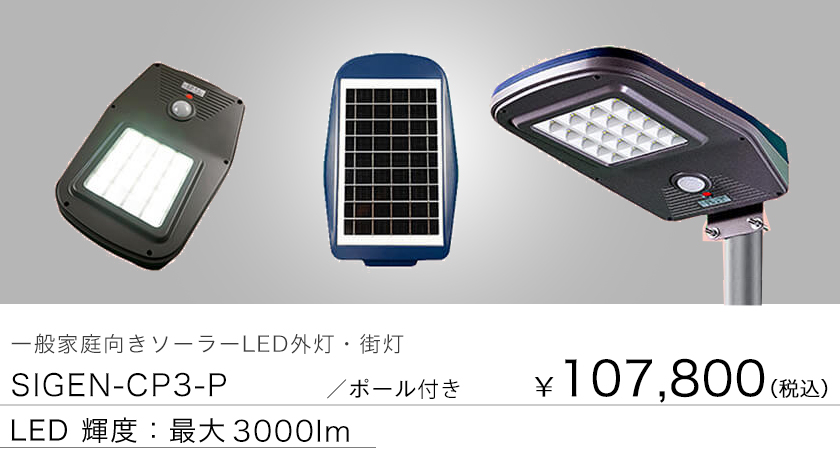 ソーラー外灯(ソーラー街灯・太陽光パネル付照明) こちらのページでは、ソーラー外灯(ソーラー街灯・太陽光パネル付照明)の取扱商品をご紹介しています。 設置場所や目的に合わせてお選びください。 ソーラー照明・取扱製品メニュー 下記タブメニューからご希望ソーラー照明をご選択ください ソーラーパネル分離型ソーラーパネル一体型360度ポールヘッド型壁付シリーズ 《SAILINGシリーズ》 ・SAILINGⅡ-6015 ・SAILINGⅡ-8020 《PEGASUSシリーズ》 ・PEGASUS-100.30 ・PEGASUS-120.40 《SUN MOVEシリーズ》 ・SUN MOVE-W40 ・SUN MOVE-W50 《HYPERLIGHTシリーズ》 ・HYPERLIGHT-W40 ・HYPERLIGHT-W60 ・SIGEN-DRONE 《GIANTLIGHTシリーズ》 ・GIANTLIGHT-W100 ・GIANTLIGHT-W120 《MACHITOシリーズ》 ・MACHITO-SS ・MACHITO-SHINE 《SCシリーズ》 ・SIGEN-SC2 ・SIGEN-SC ・SIGEN-DRONE ・SIGEN-L2 ・SIGEN-L2t ・SIGEN-CP3 ・SIGEN-RS3012 ・SIGEN-FM4012 ソーラーパネル分離型 「ソーラーパネル分離型」の特徴は、LEDライト本体と大型ソーラーパネルが分離している点にあります。パネルの角度を太陽の向きに合わせて調整できるため、効率的に充電が可能です。一体型に比べて、より大きなソーラーパネルを搭載できるため、蓄電効率が高く、長時間点灯しやすいのが特長です。 SAILINGⅡシリーズ PEGASUSシリーズ ソーラーパネル一体型 「ソーラーパネル一体型」は、ソーラーパネルとライトが一体化したスタイリッシュなモデルが多く、ゴルフ場・テニスコートなどのスポーツ施設などに適しています。また、沿岸部など風が強い地域や台風の多い地域では、ソーラーパネル分離型の場合、風にあおられやすい傾向があります。そのため、そのような環境ではソーラーパネル一体型の設置をおすすめしております。 SUN MOVEシリーズ HYPERLIGHTシリーズ GIANTLIGHTシリーズ 360度ポールヘッド型 ポールヘッド型は、「360度全方向」を照らすことが出来るソーラーライトです。 デザイン性に優れ、自然に周囲と溶け込むため、公園・テナント施設・広場・商業施設・大型駐車場などの広範囲照明に適しています。 MACHITOシリーズ SCシリーズ 壁付シリーズ (ポール取付も可)