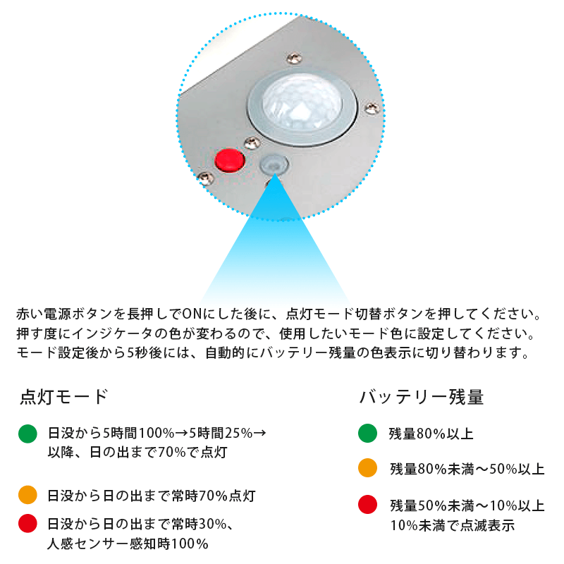 赤:日没から日の出まで常時30%、人感センサー感知時100%で点灯