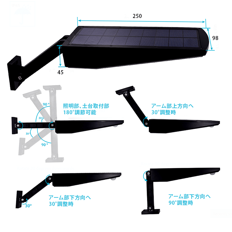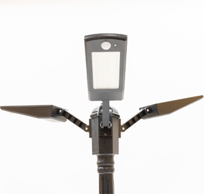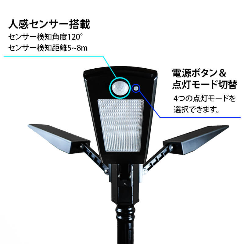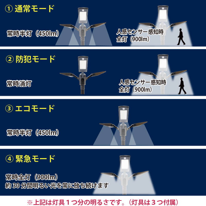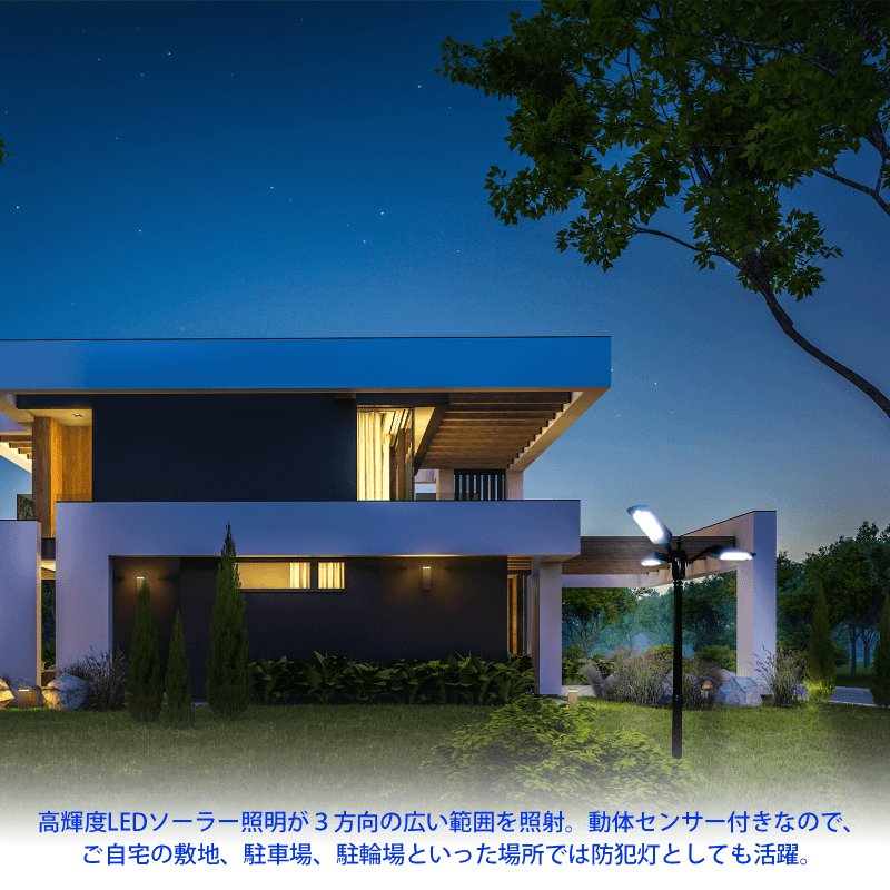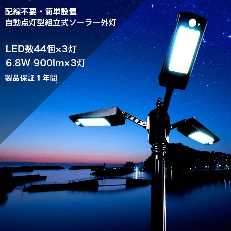 シゲンソーラーオリジナル、3方向アーム型ソーラーLED照明SIGEN-L2t。1灯あたり900lmの照明が3つと4段組み立て式ポールがセットになって価格は驚愕の、黒:48,000円(税抜)・白:58,000円(税抜)です。照明部は取り外しが可能なため、普段はお庭や駐車場などの防犯灯、庭園灯(ガーデンライト)として、災害等による停電時には室内照明としてご利用いただけます。サーチライトとしてご自宅での駐車場照明等に最適なソーラー照明・ガーデンライトです。