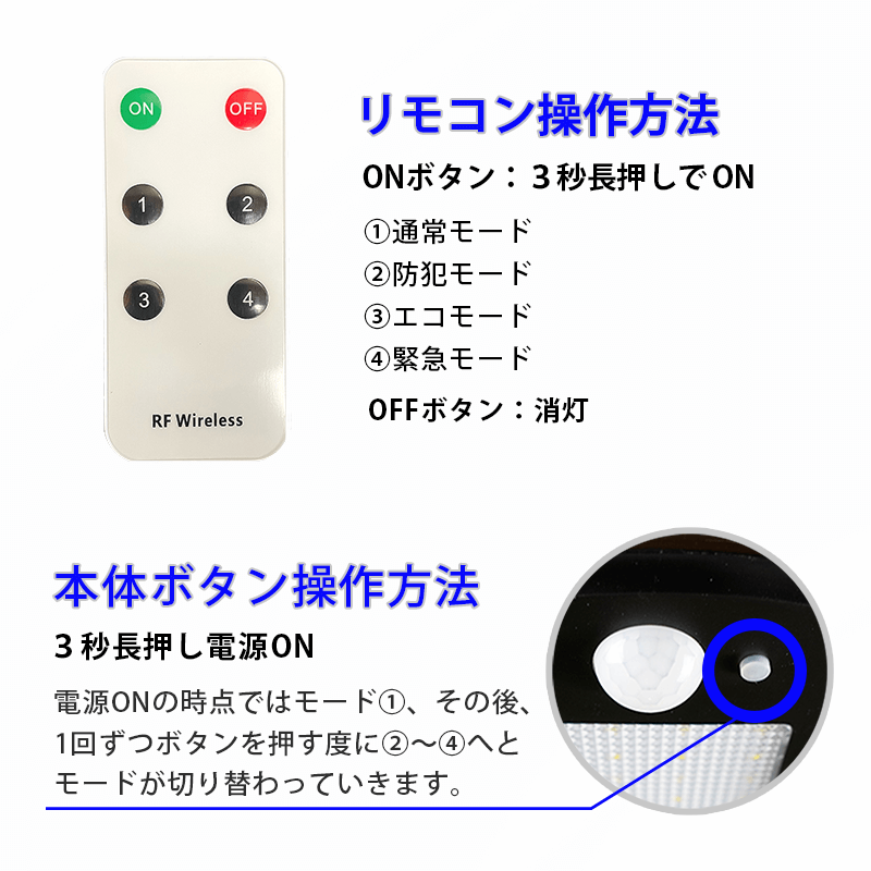 点灯モード モード1.常時半灯、センサー感知時全灯(15秒)