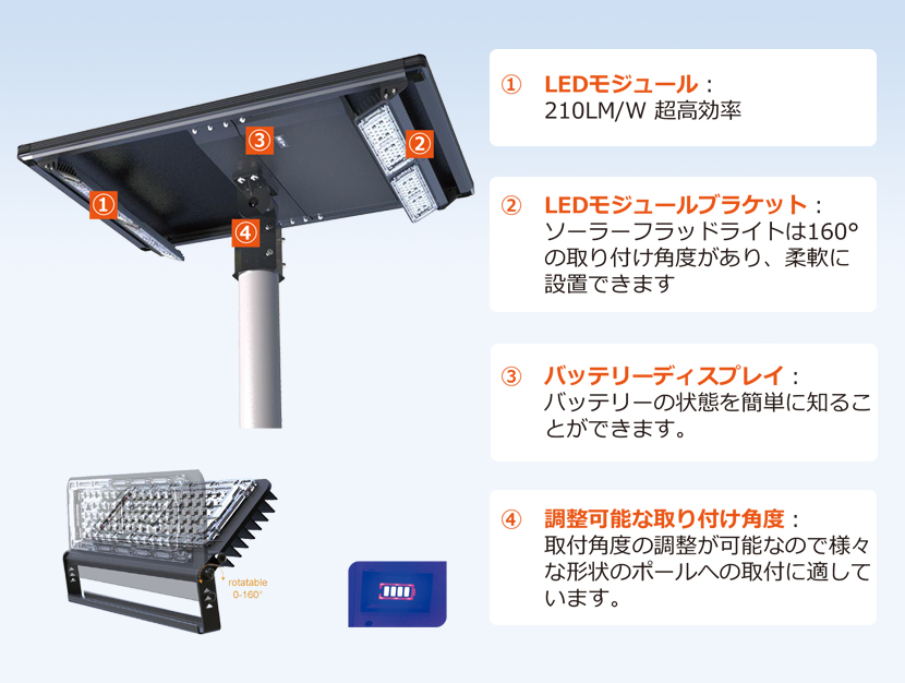 設置場所に応じてLED照明の角度160°自在に設置が可能です。ソーラーパネル・ライト・バッテリーが一体型で照明が2方向を照射します。日没後に5時間100%点灯、その後日の出まで最大7時間点灯(25%点灯)します。公共事業からご家庭まで、公園照明、駐車場照明、道路照明等、様々なシーンで活躍する弊社主要ソーラー照明・街灯です。